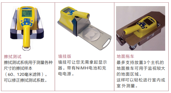 串行接口 RS 232(PC,打印機(jī)) 增強(qiáng)充電 / 線路操作 外部探測(cè)器 墻壁安裝支架 / 涂抹測(cè)試臺(tái) |