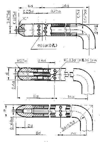 上圖是一般皮托管的結構,為了能看清,把兩端放大。如圖中可以看到皮托管外形是一個L型的金屬管,與管軸平行安置的直角邊是測頭,其頂端有一個總壓孔,在其側壁上有若干個靜壓孔??倝嚎着c靜壓孔不相通,分別用導壓管引出,從靜壓孔至總壓孔稱為鼻端。直角的另一邊稱為支桿,引出總壓孔和靜壓孔的接頭以便與微壓計的管相連接。其上有定向桿,指示鼻端方向。測量總壓力的管子叫皮托管,測量靜壓力的管子叫靜壓管。實際上常用的都是皮托管和靜壓管的組合,而且多數(shù)使用實驗系數(shù)接近為1的形狀,也*是國際標準推薦的GETIAT(錐形頭)型,AMCA型(球形頭),MPL型(橢圓形頭三種),如下圖所示