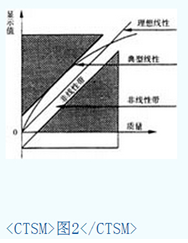 線性檢定是指加載試驗時,所加載荷與相應示值之間的線性關系好壞的一種評估,常用天平示值與理想線性直線即從零載到*大秤量的連線之間的正或負*大偏差值表示,如圖2。