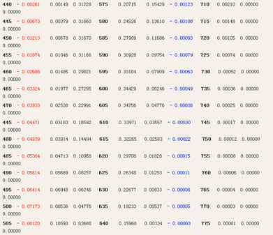 下面我們來分析“1931 CIE-RGB系統標準色度觀察者光譜三刺激值”的基本情況以及出現“負值”的根本原因。(請見下表)。該表中的黑色數值的部分是參與光譜色匹配的“光原色”的部分。對于該表中的“負值”部分,我們用了紅、綠、藍三種顏色做了標識。
